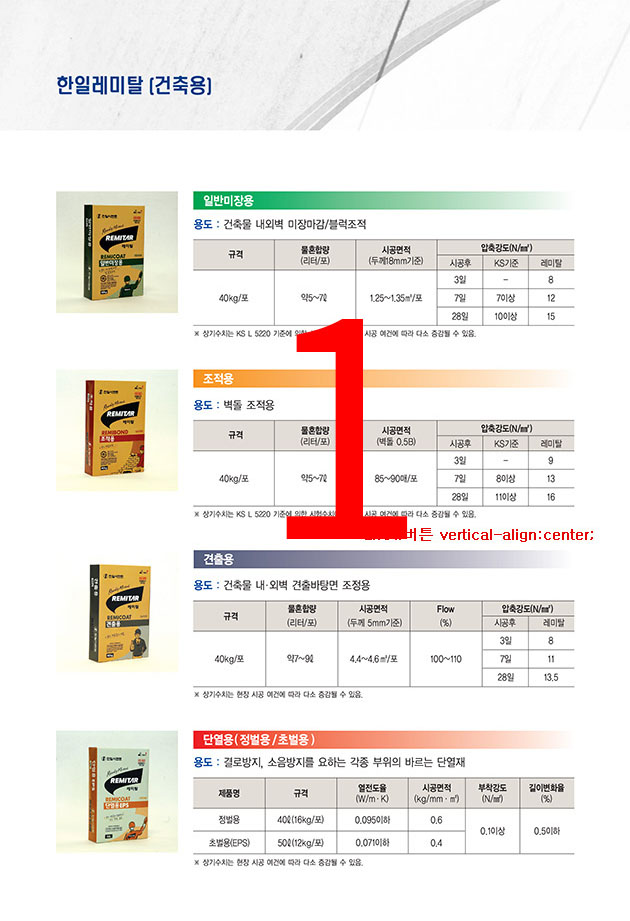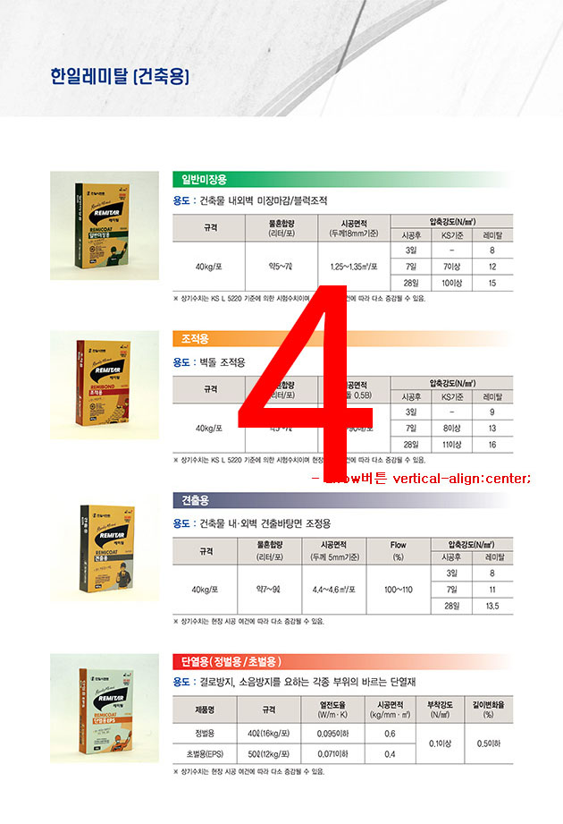 * 상기 수치는 KS L 5220 기준에 의한 시험수치이며, 현장시공 여건에 따라 다소 증감될 수 있음.