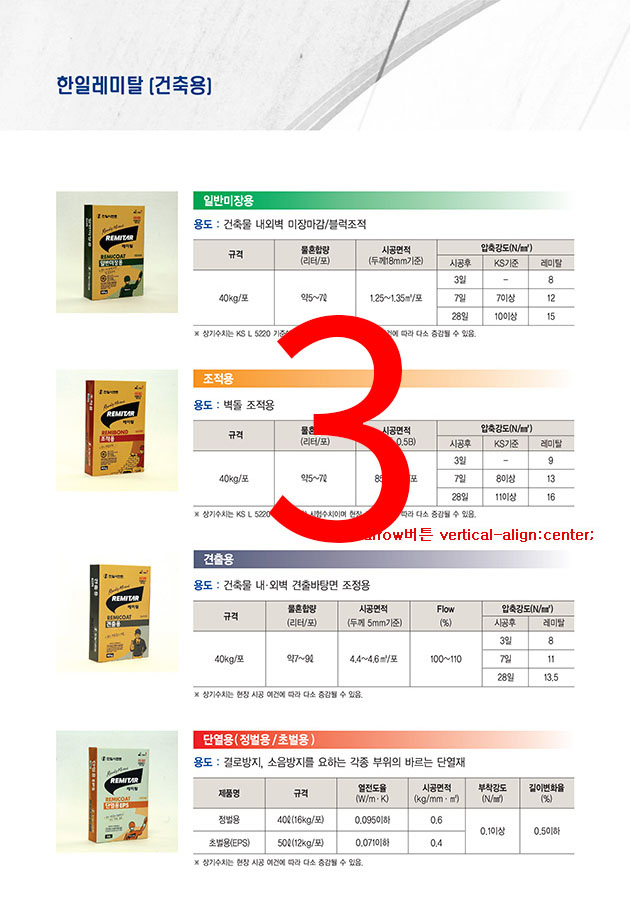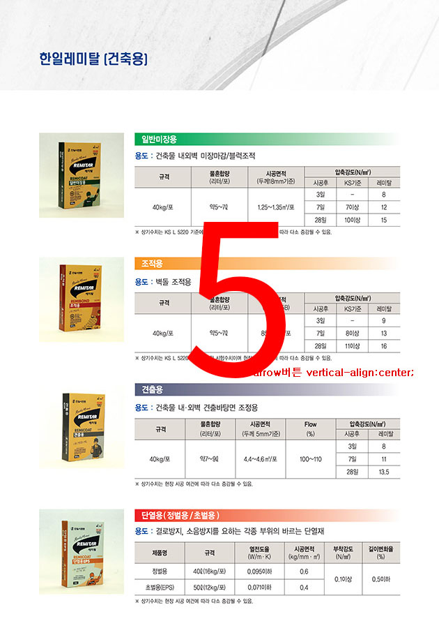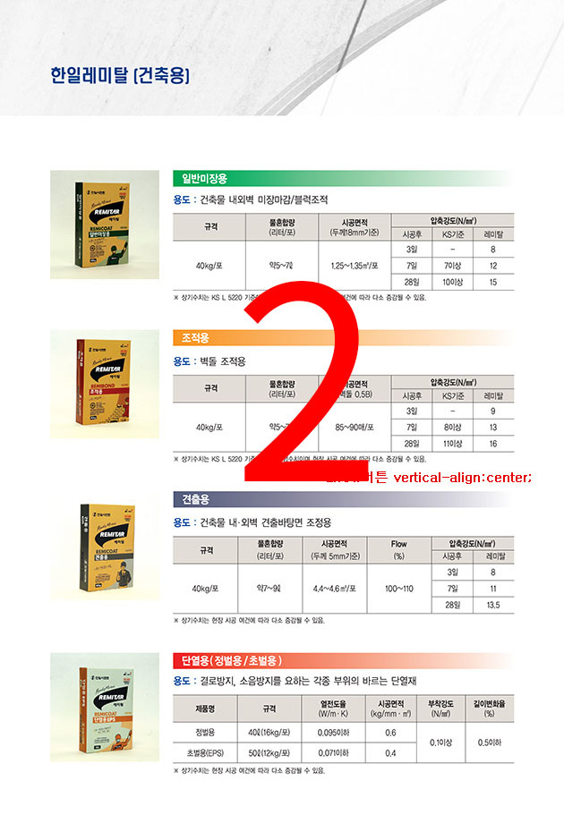 | 레미픽스 13000 | 300㎜x300㎜ 이하 | 약2.0kg/㎡ | 일반용/내한용 |